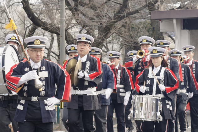新年恒例の行事として行われるのが「出初式(でぞめしき)」です。ラッパ隊の演奏に合わせて大門商店街で分列行進を行い、市民の皆さんに向けて防火・防災意識の啓発をしています。4月には「消防団任命式」が開催されて、新しく任命された団員への辞令交付や、消防団長からの訓辞が行われます。これら式典を彩るのはラッパ隊と音楽隊の演奏です。