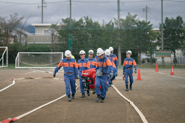 地域に合わせた訓練が、各分団ごとに実施されています。なかでも代表的なのは「操法訓練」です。火災現場で必要となるポンプ車及び小型ポンプの操作や、ホースの展張から、放水、撤収までの一連の動作を、迅速かつ正確に実施するための訓練です。毎年6月頃に開催される「松本消防協会ポンプ操法・ラッパ吹奏大会」には担当分団が出場し、成績上位分団は県大会へと出場します。