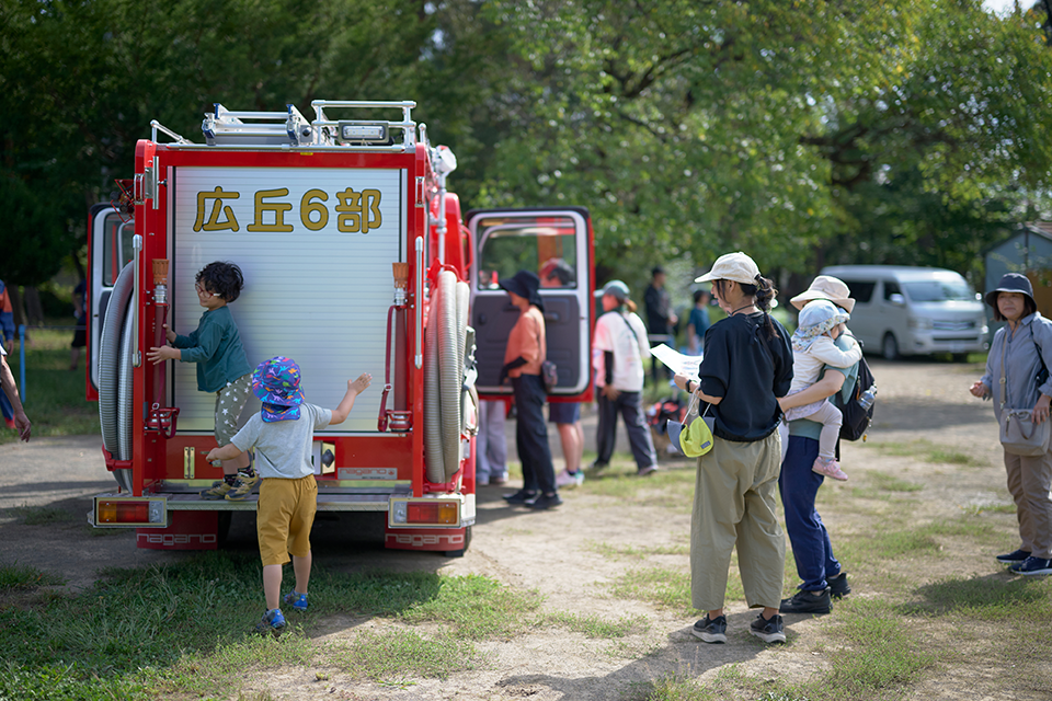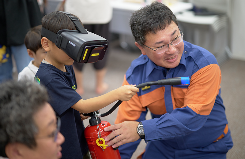 消防署と協力し、防火・防災への意識を高めてもらう「体験型消防防災フェスタ」を開催しています。当日は、子どもたちや若い世代、子育て世代の方々にも楽しんで参加していただけるよう、さまざまな体験ブースを設けています。 子どもたちに消防車に乗車体験をしてもらったり、VRでの消火体験を楽しんでもらったりと、遊びながら学べる内容が盛りだくさんです。また、大人の方にもAED操作体験や煙体験などを通して、日常からできる備えを考えてもらうきっかけをつくっています。