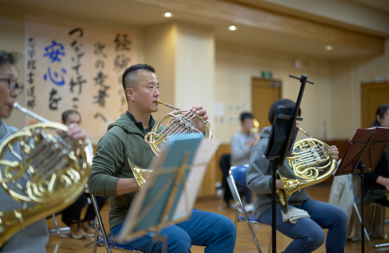国や自治体の方針として、これまで学校の先生が担ってきた部活動の指導を、地域の団体がサポートする動きが広がっています。音楽隊もその一環として、広丘小学校や広陵中学校の吹奏楽部の指導に関わる機会をいただいています。 実際に子どもたちと向き合う中で、「どうしたら上手に吹けるようになるのか」「どんな言葉で伝えたらわかりやすいか」と考えながら指導しています。子どもたちが少しずつ上達していく姿に、団員一同やりがいを感じます。また、「しおじり消防防災フェスタ」では、吹奏楽部の子どもたちと一緒にステージに立ちました。音楽を通じて子どもたちと交流することで、消防団の活動を知ってもらえる大切な時間になっています。